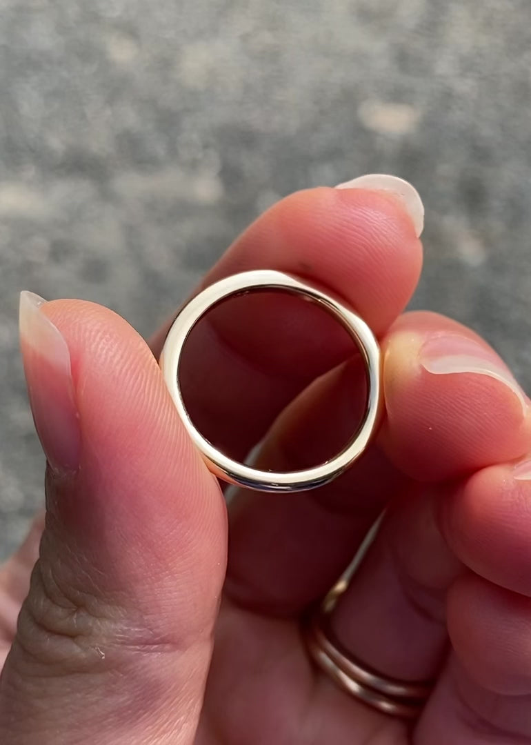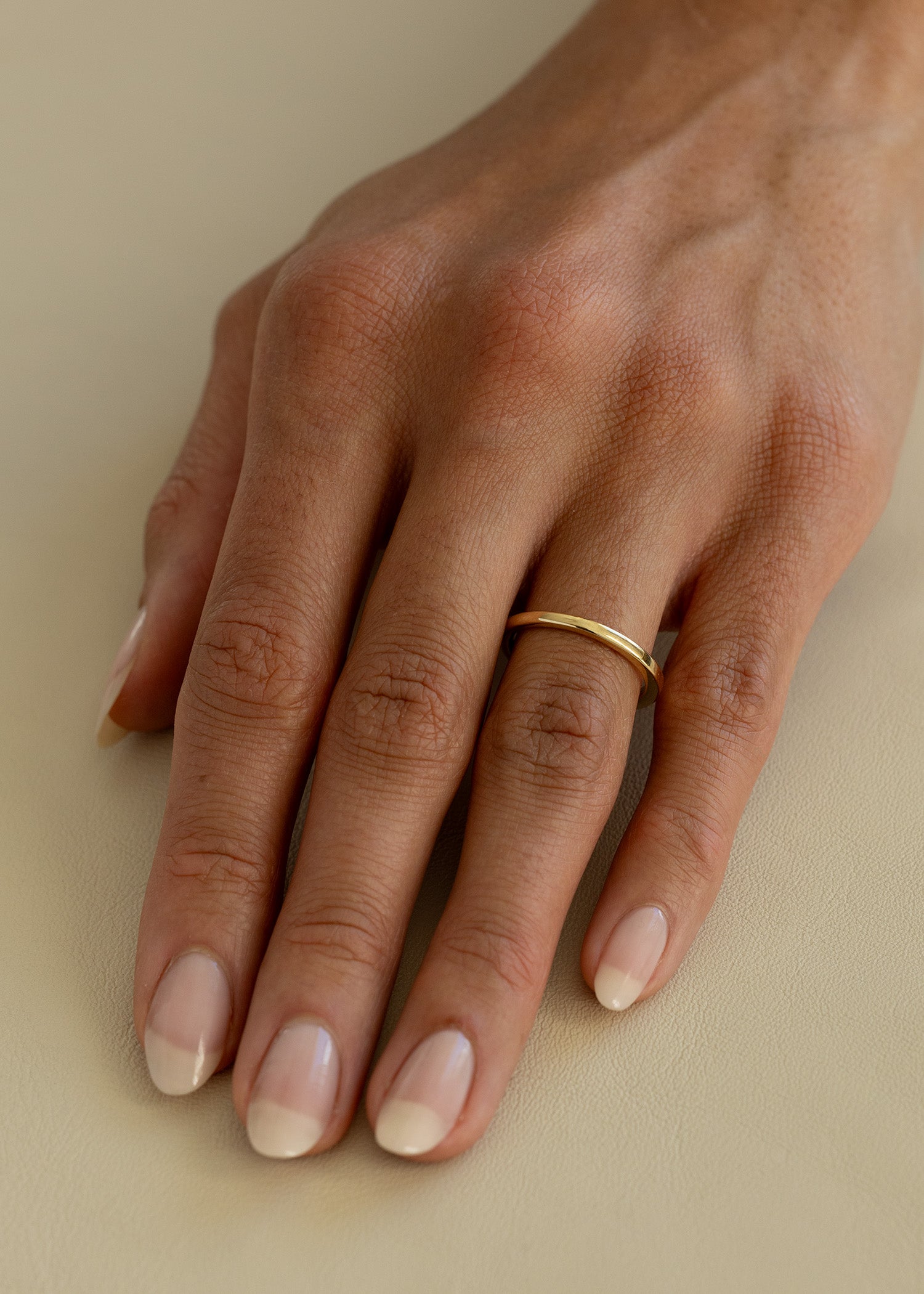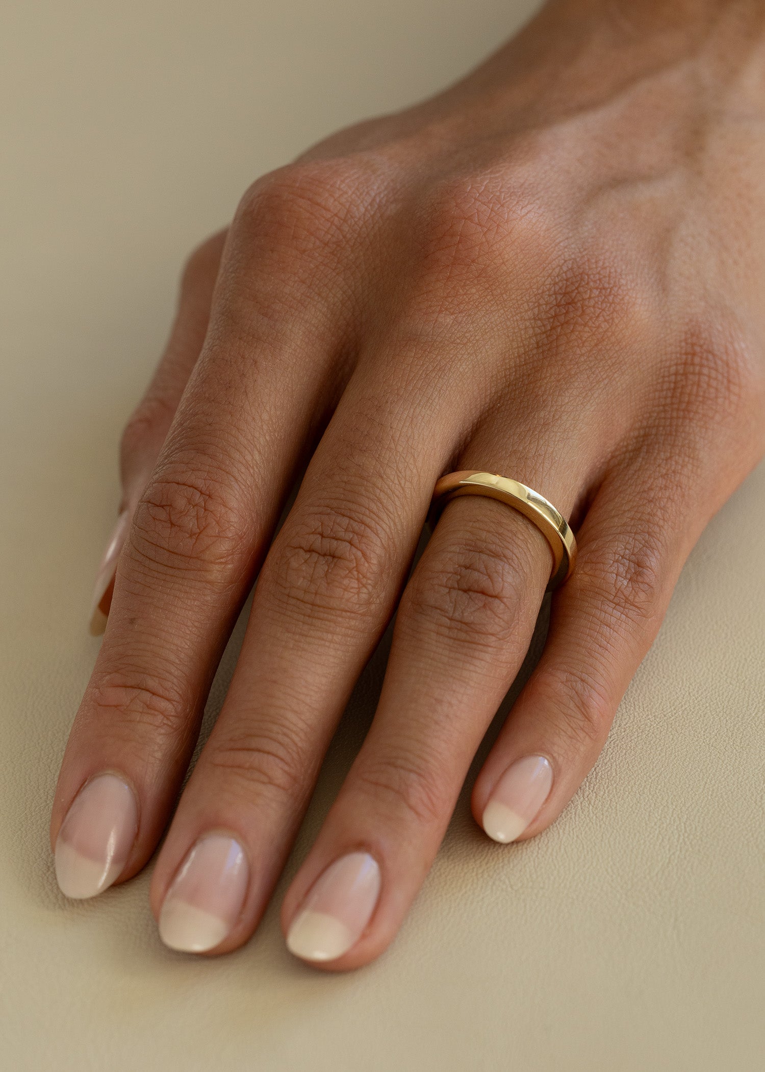 The dynamic band, an M. Hisae signature. A beautiful genesis of movement out of static, geometric forms. This design reflects upon the idea of embracing and flowing seamlessly through whatever life presents us. Every turn is a right turn. Two forms become one. This sentiment is especially reflected in love relationships, making it a beautiful, meaningful, and sleek wedding band.