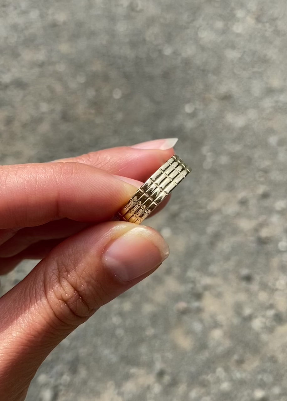 • Because of the generous width and thickness of this band, we recommend sizing up 1/4 to 1/2 size from your normal ring size.