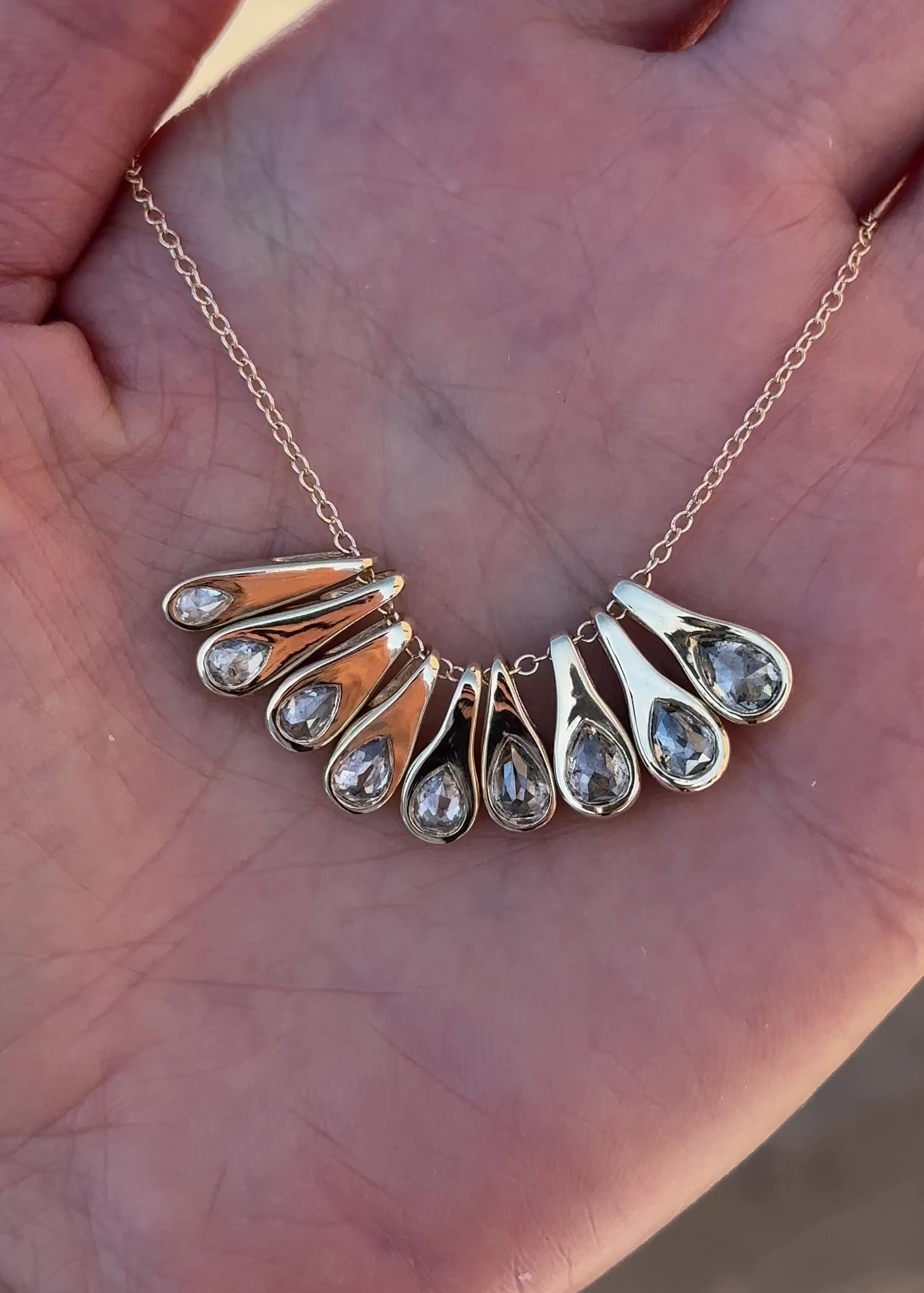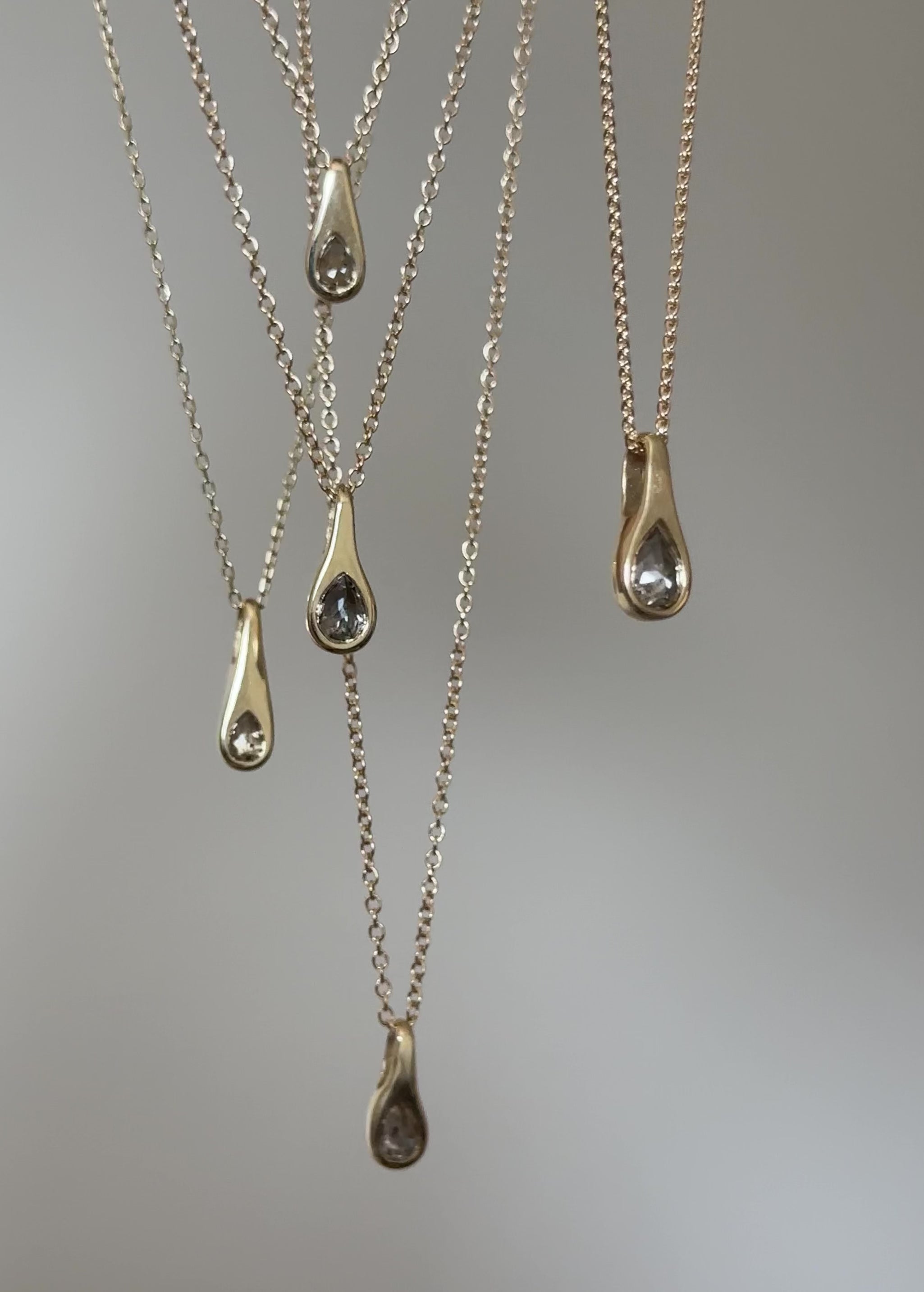 Enjoy the feelings of a cocoon of warmth and safety infused into a unique champagne diamond charm. Each pear-shaped diamond is a slightly different shape, depth, and hue. A rosecut faceted stone was chosen to mimic the iridescence of a butterfly emerging from its chrysalis. Each pendant is a tiny, loving home, a cradle of protection.