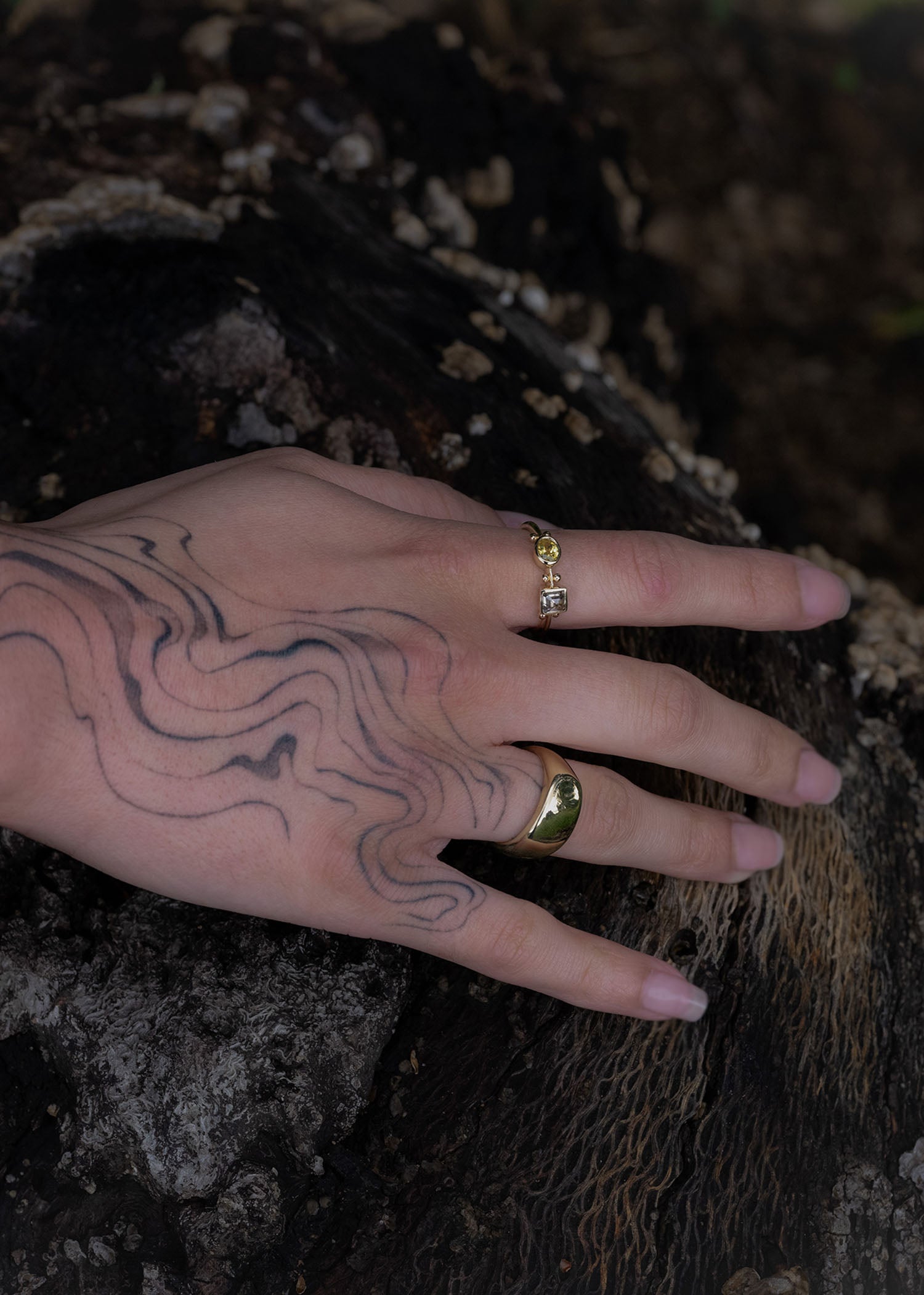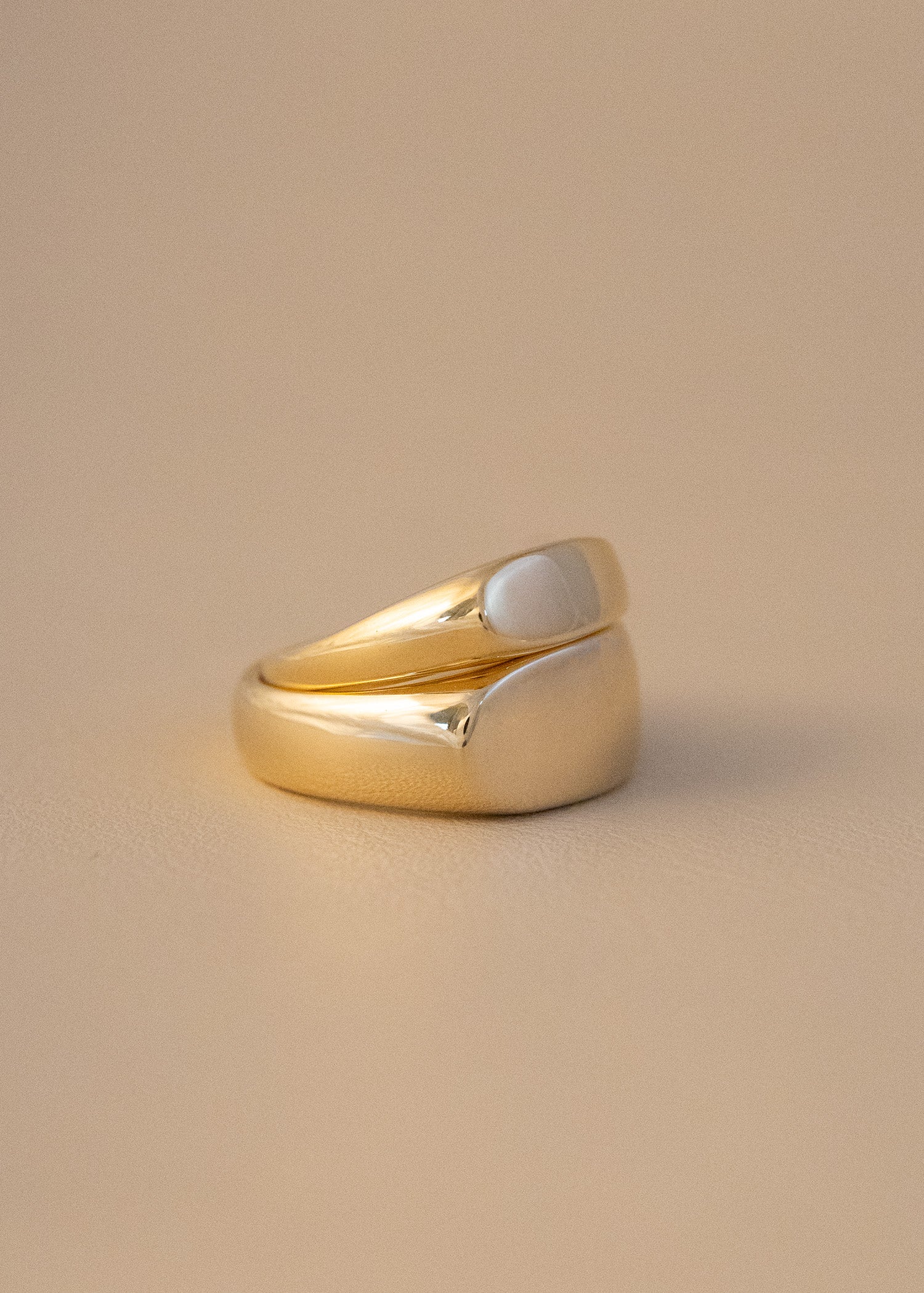 The un-classic gold band with clean asymmetry and soft substance. Also see the narrower version here and our best-selling diamond-encrusted version, the Lila Suprima Ring, here.